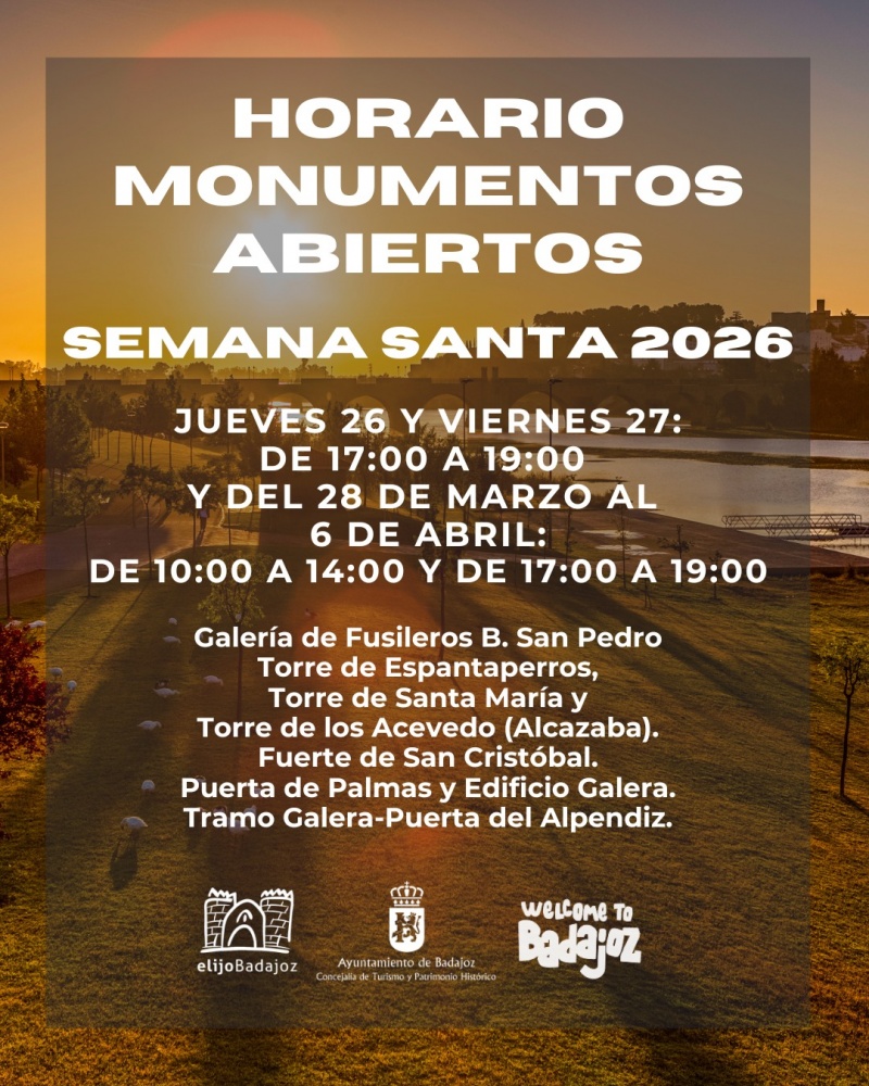 Los monumentos de la ciudad de Badajoz permanecerán abiertos con horario especial. Los jueves 26 y viernes 27 de marzo: de 17:00 a 19:00. Y del 28 de marzo al 6 de abril: de 10:00 a 14:00 y de 17:00 a 19:00.