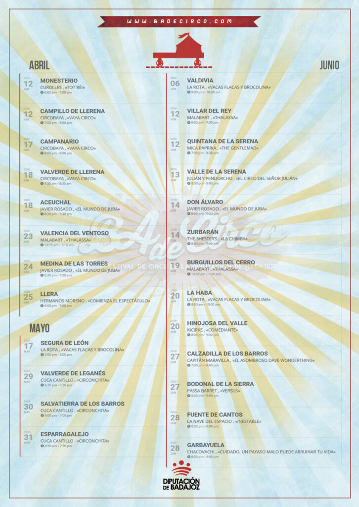 Su compañía, Escuela de Circo ‘La rota’, es una de las 15 que participarán en el programa de este año, que dará comienzo el 12 de abril en Campillo de Llerena y Monesterio, estará en marcha durante más de 2 meses y finalizará el domingo 28 de junio en Garbayuela. El circo cuenta con 5 compañías de la provincia y 5 de otros países como Italia o Portugal.