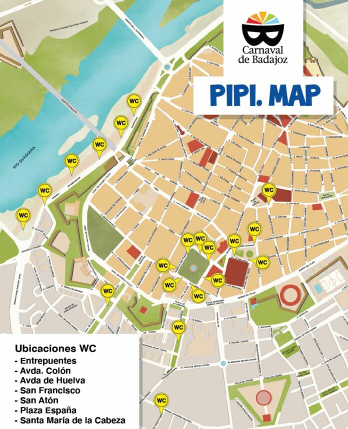 Lo más gracioso es sin duda el nombre con el que ya se le bautizó el año pasado a esta simpática pero muy útil infografía, el ‘Pipi Map’, donde, más allá del gracioso nombre, se espera que todos los pacenses y los carnavaleros visitantes respeten para que la ciudad se mantenga lo más limpia posible donde se esperan grandes multitudes de gente y varias noches que se extenderán hasta altas horas de la madrugada.