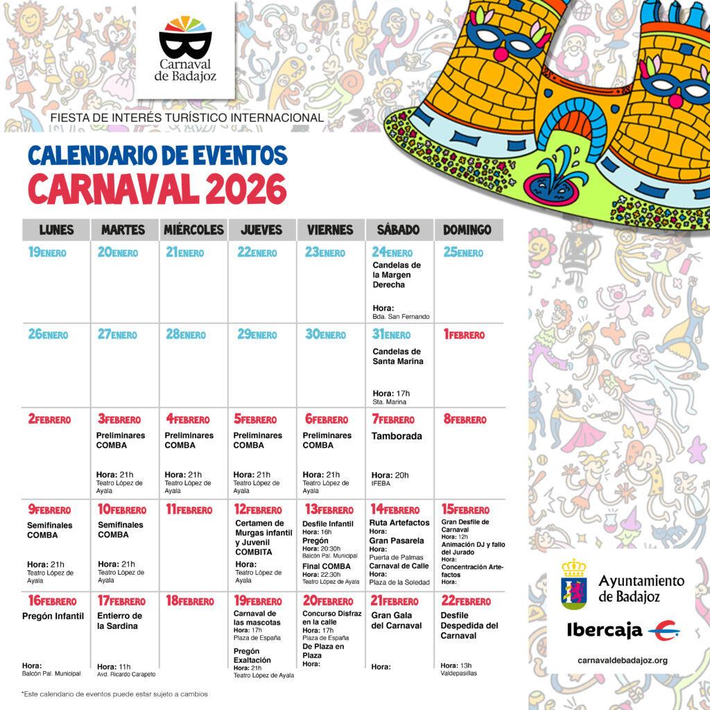 Y tras esto, llega el gran día, el viernes 13 de febrero, donde habrá una tarde noche cargada de eventos y de emoción, que dará comienzo con el Desfile Infantil a las 16:00. A las 20:30, en la Plaza de España, y más en concreto en el balcón del Ayuntamiento, se producirá el Pregón, encabezado y protagonizado por el grupo emergente Sanguijuelas del Guadiana. Y a las 22:30 en el Teatro López de Ayala será la Gran Final del COMBA, donde, tras el triunfo de Marwan en 2025, buscan sucesor (si estos últimos no repiten, claro).