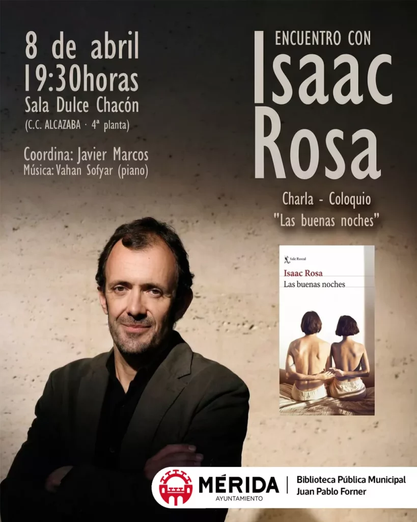 El próximo miércoles 8 de abril en Mérida, a las 19:30h, la sala Dulce Chacón de la Biblioteca Municipal Juan Pablo Forner acogerá un encuentro literario con el escritor Isaac Rosa, con motivo de la presentación de su última novela, “Las buenas noches”.