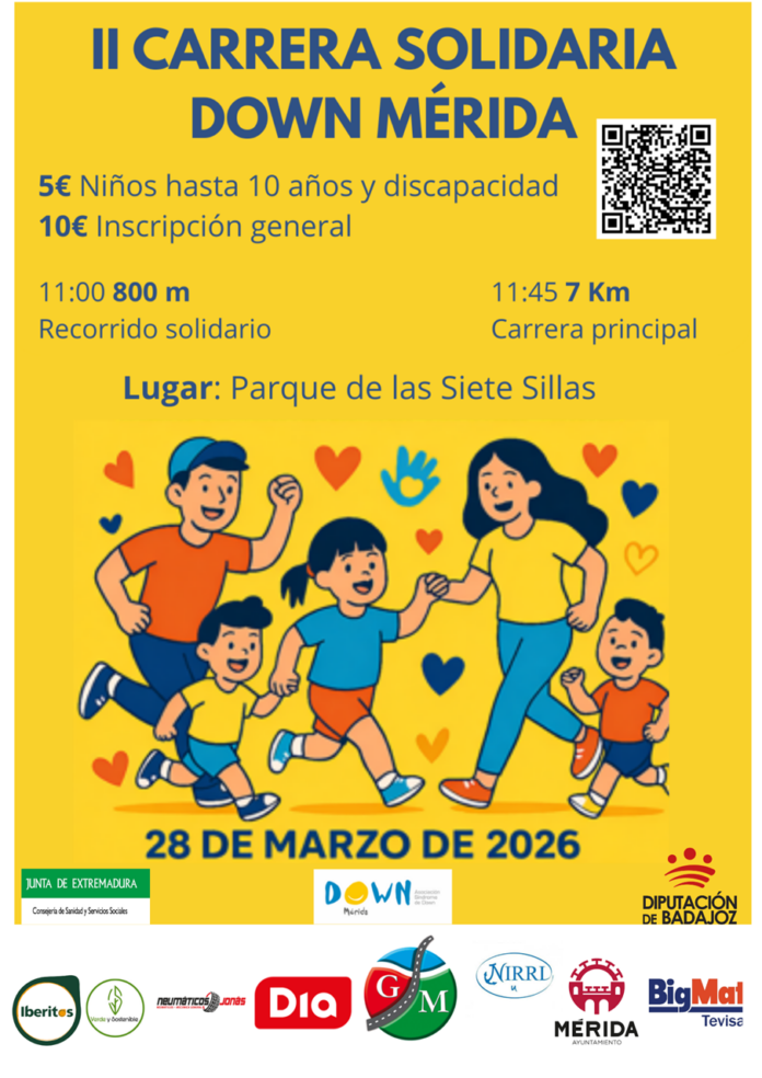 La Asociación Down Mérida organiza la II Carrera Solidaria, el domingo 28 de marzo, en el Parque de las Siete Sillas. En colaboración del ayuntamiento de Mérida, la entidad pone en marcha otras iniciativas con el objetivo de sensibilizar a la sociedad sobre inclusión y visibilizar las capacidades de las personas con síndrome Down.