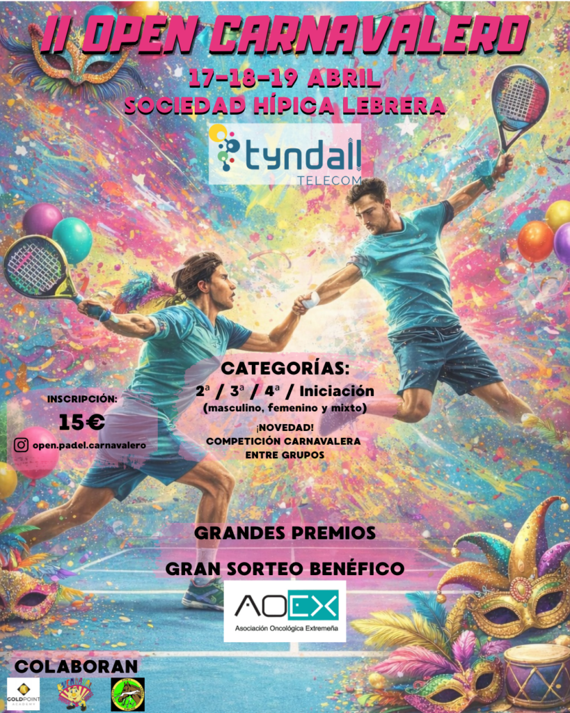 La comparsa Vendaval organiza del 17 al 19 de abril en la Sociedad Hípica Lebrera la segunda edición del Torneo Carnavalero de Pádel, una iniciativa que nació el año pasado con la idea de alargar un poco más el carnaval y que, visto el resultado, ha venido para quedarse.